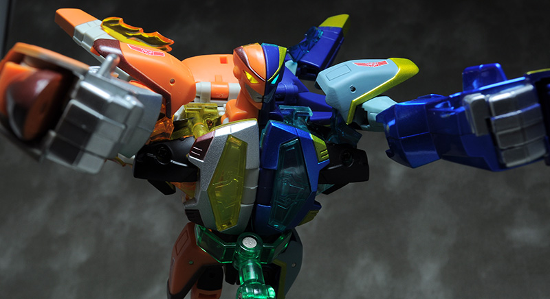 双子のオートボットであるジェットファイアーとジェットストームが完全シンメトリー合体した姿である。